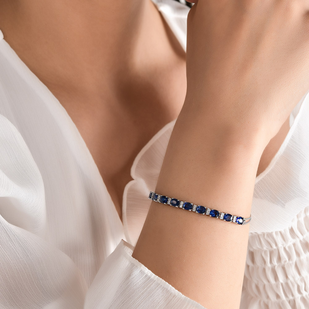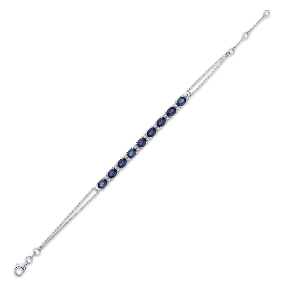 This exquisite bracelet is crafted from 14K white gold and features a stunning array of sapphires, elegantly showcasing sophistication and style.